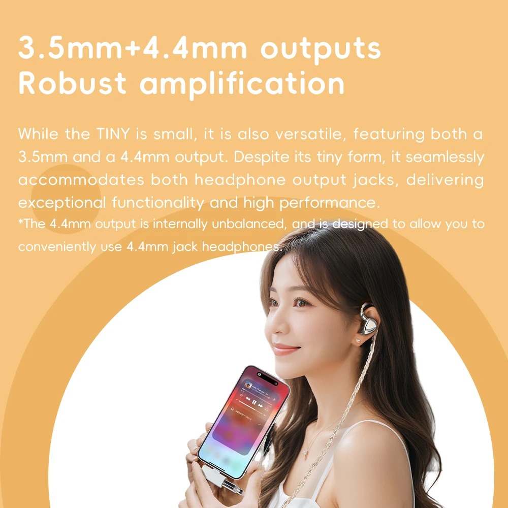 TINY B: 3,5 mm + 4,4 mm Kopfhörerausgänge, eine Single-Ended-Architektur, die eine mit einer symmetrischen Architektur vergleichbare Ausgangsleistung erzielt und die gleichzeitige Ausgabe über beide Anschlüsse unterstützt.