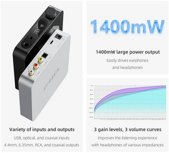 Der FiiO K11 ist ein hochleistungsfähiger USB-DAC/AMP. Das Gerät ist mit einer leistungsstarken Kopfhörerverstärkersektion mit drei Verstärkungsstufen ausgestattet, die eine starke Ausgangsleistung von bis zu 1400mW bei 32Ω Impedanzlast über den symmetrischen Anschlussausgang liefert. Er kann die meisten Kopfhörer und In-Ear-Monitore problemlos ansteuern.