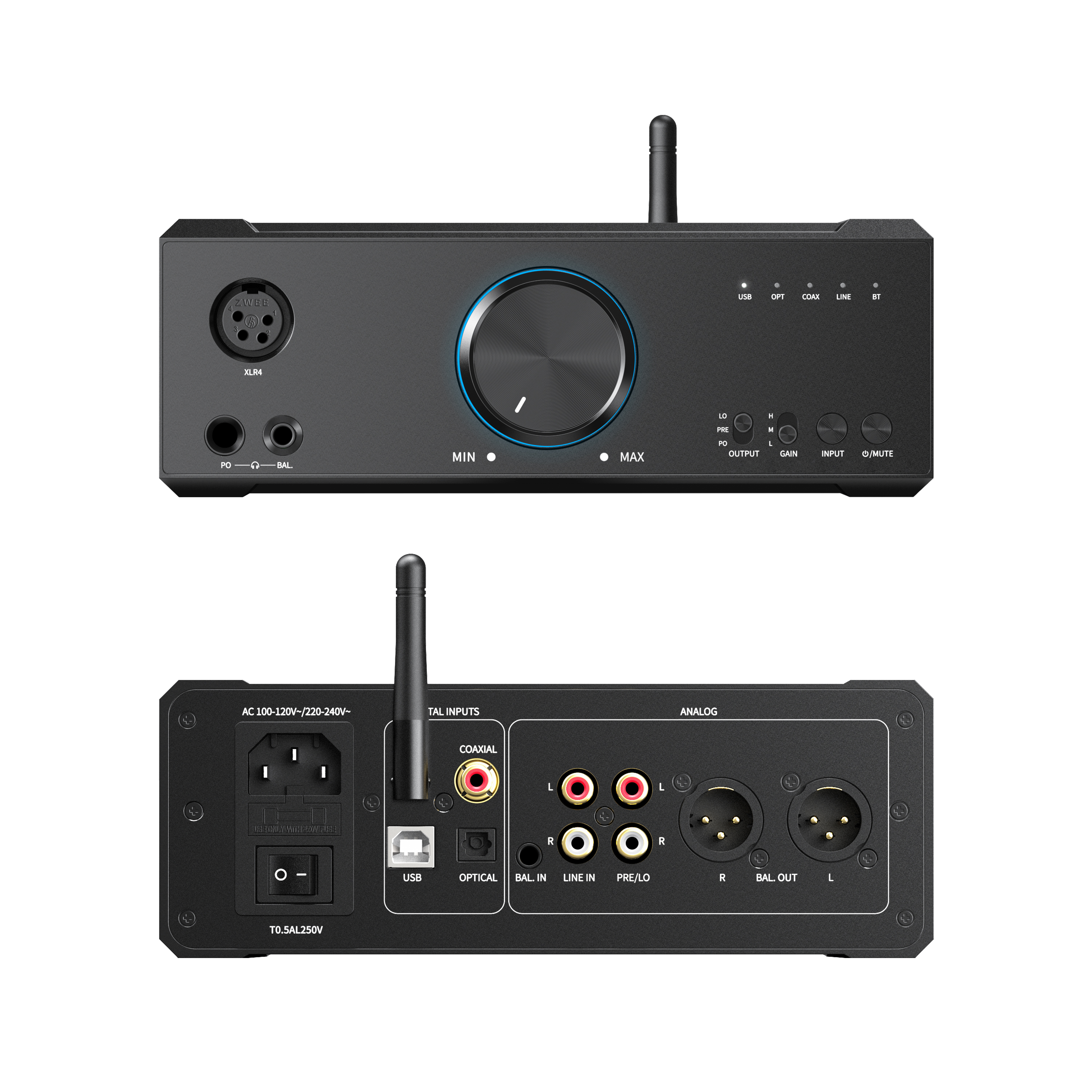 LO: Nur die rückwärtigen analogen RCA+XLR-Ausgänge sind aktiv, haben die maximale Ausgangsleistung und können nicht mit dem Lautstärkeregler eingestellt werden
