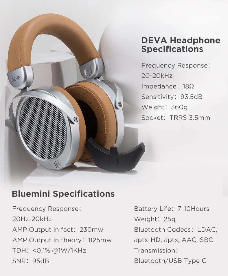 Der DEVA verbindet erfolgreich zwei Welten miteinander. Er ist ein moderner Bluetooth-Kopfhörer mit aktivem Betrieb nach den aktuellen Bluetooth-Standards. Zugleich ist er ein passiver Kopfhörer mit analogem Anschluss und für seine Preisklasse spektakulär natürlichem Klang. Um dies möglich zu machen, bedient man sich bei HIFIMAN eines Tricks. Der Lieferumfang des DEVA umfasst ein abnehmbares Bluetooth-Modul namens „Bluemini“, das für einen kabellosen Betrieb einfach per Hand an die Ohrmuschel angedockt wird. Der DEVA kann zudem mit einem USB-Kabel an einen Computer angeschlossen werden und auf diesem Weg den D/A-Wandler im Inneren des Bluemini ansteuern, während er parallel auflädt. Ab sofort mit BlueMini III mit Bluetooth 5.0 und 3-Meter-Zuleitungskabel.